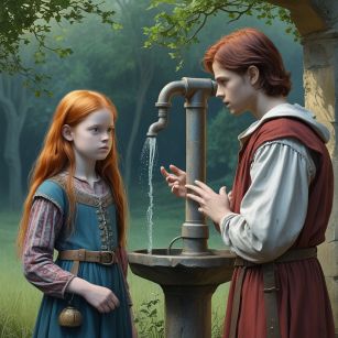 Ich füttere sie mit Stichworten zu meinen Geschichten und zweifele mehr als einmal an der Entscheidung. Der Versuch, ein Bild von einem mittelalterlichen Dorfbrunnen zu bekommen, ergibt die seltsamsten Konstruktionen. Mal sieht es aus wie ein moderner Springbrunnen, mal stehen die Personen im Brunnen. Das rechte Bild ist das Beste, was ich bekam... leider ohne Winde, Seil und Eimer